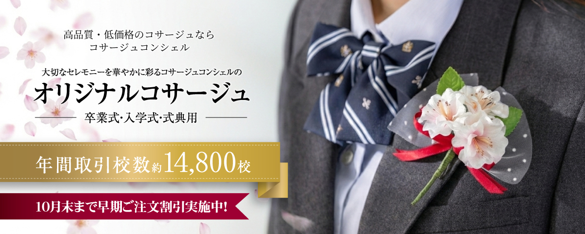 人気商品ランキング 総合 小学校 中学校 高校 完成品 桜 桜のコサージュ 価格: 270円~ 税込 完成品 バラ サニーローズ 価格: 220円~ 税込 完成品 バラ ジュエルローズ 価格: 290円~ 税込 もっと見る 完成品 桜 桜のコサージュ 価格: 270円~ 税込 完成品 バラ サニーローズ 価格: 220円~ 税込 完成品 バラ ブライトローズ 価格: 240円~ 税込 もっと見る 完成品 桜 桜のコサージュ 価格: 270円~ 税込 完成品 バラ サニーローズ 価格: 220円~ 税込 完成品 バラ ジュエルローズ 価格: 290円~ 税込 もっと見る 完成品 桜 桜のコサージュ 価格: 270円~ 税込 完成品 バラ ジュエルローズ 価格: 290円~ 税込 完成品 カトレア カトレアルーチェ 価格: 270円~ 税込 もっと見る おすすめ商品 完成品 バラ サニーローズ 価格: 220円~ 税込 完成品 バラ ココローズ 価格: 230円~ 税込 完成品 カトレア カトレアクレール 価格: 240円~ 税込 完成品 桜 桜のコサージュ 価格: 270円~ 税込 花の種類 コサージュコンシェルの特長 お知らせ 2026.03.30 お知らせ ゴールデンウイーク休業のお知らせ 2026.02.10 お知らせ 3月31日 臨時休業のお知らせ 2026.02.10 お知らせ 25年度コサージュまだ間に合います! 2025.12.08 お知らせ 年末年始休業のお知らせ 2025.09.10 お知らせ 10月25日 臨時休業のお知らせ もっと見る