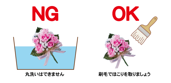 造花のコサージュには、リボンやパール等の装飾品や洋服に留めるためのピンが付いているため、丸洗いはできません。