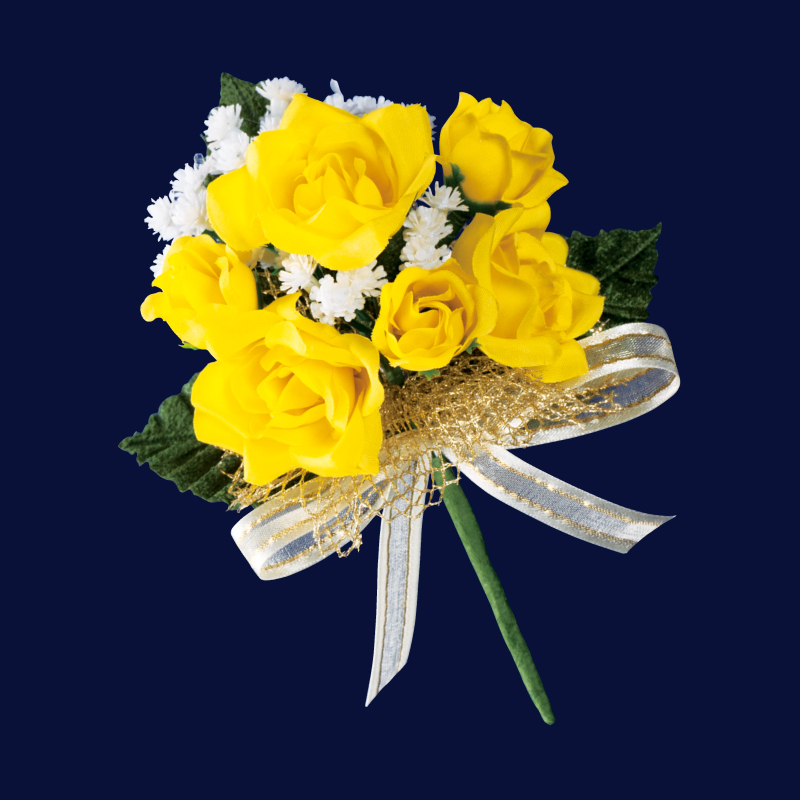 ゴールドのチュールと、ラインの入ったリボンをあしらっているので、一層華やかさを演出します。お花の後ろには濃い緑色の葉が3枚寄り添い、お花とのコントラストが際立って胸元を鮮やかに彩ります。