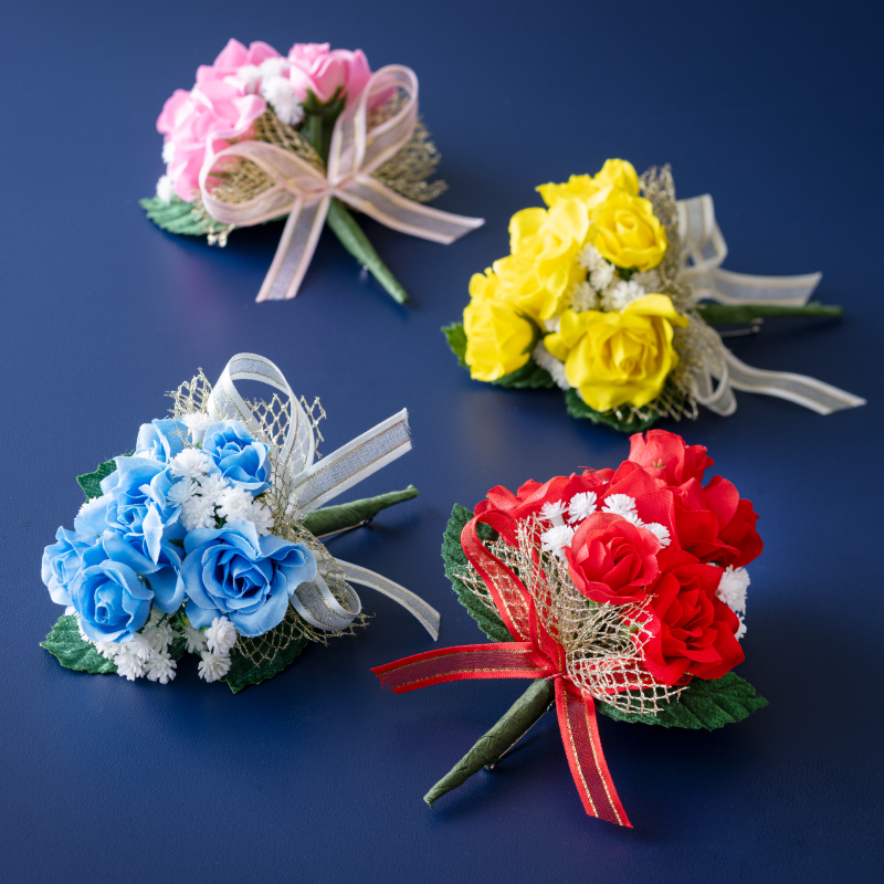 大きさの違う大小のバラと、かすみ草の組み合わせが豪華なコサージュ。