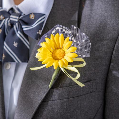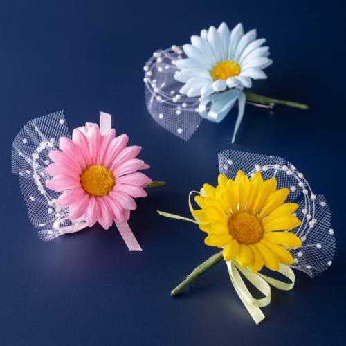 華やかなガーベラにドットのチュールを添えた明るい雰囲気のコサージュ。卒業式や入学式を華やかに彩ります。