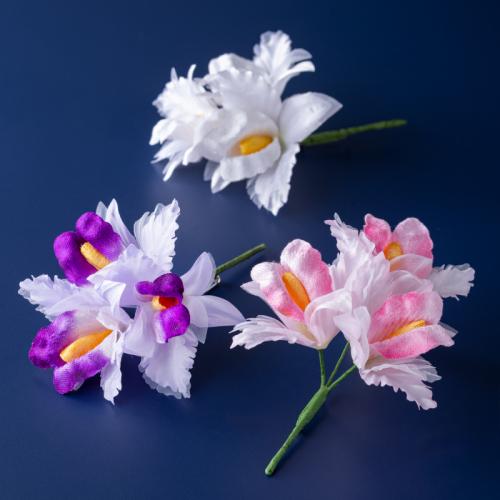 落ち着いた色味と、生地感にこだわった大きなカトレアを3輪まとめ、何層にも重なった花びらが周りに添えられた、ボリューム感あるコサージュ。シンプルさと上品さを兼ね備えた仕上がりは、先生方からも大人気です。
