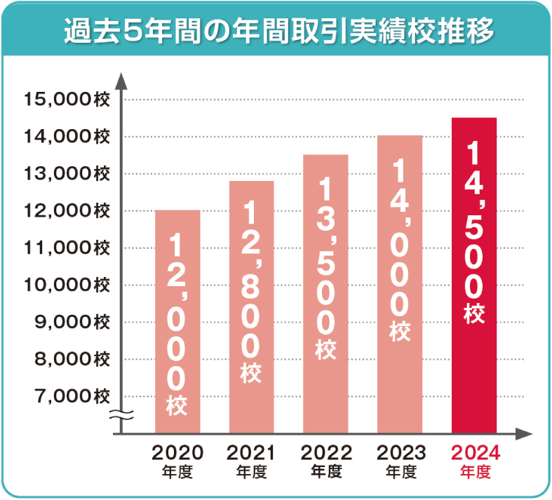 2024年度は全国約14,500校の学校様より弊社の商品およびサービスをご利用頂きました。心よりお礼申し上げます。